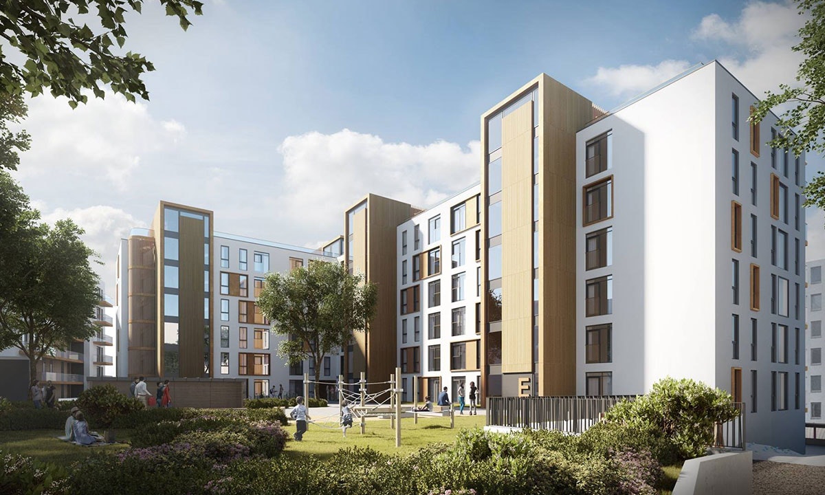 Op Sandakerveien in Oslo staan moderne topgebouwen die behoren tot het gebied Myrenskvartalet op Torshov. De gebouwen bieden 118 stadsappartementen. Voor dit project produceerde Eurostair® een vijf verdiepingen hoge wenteltrap met een op maat gemaakt frame om verticale houten pilaren aan te bevestigen die een kooi vormen en een gepoedercoate rechte trap met voorgevormde treden.